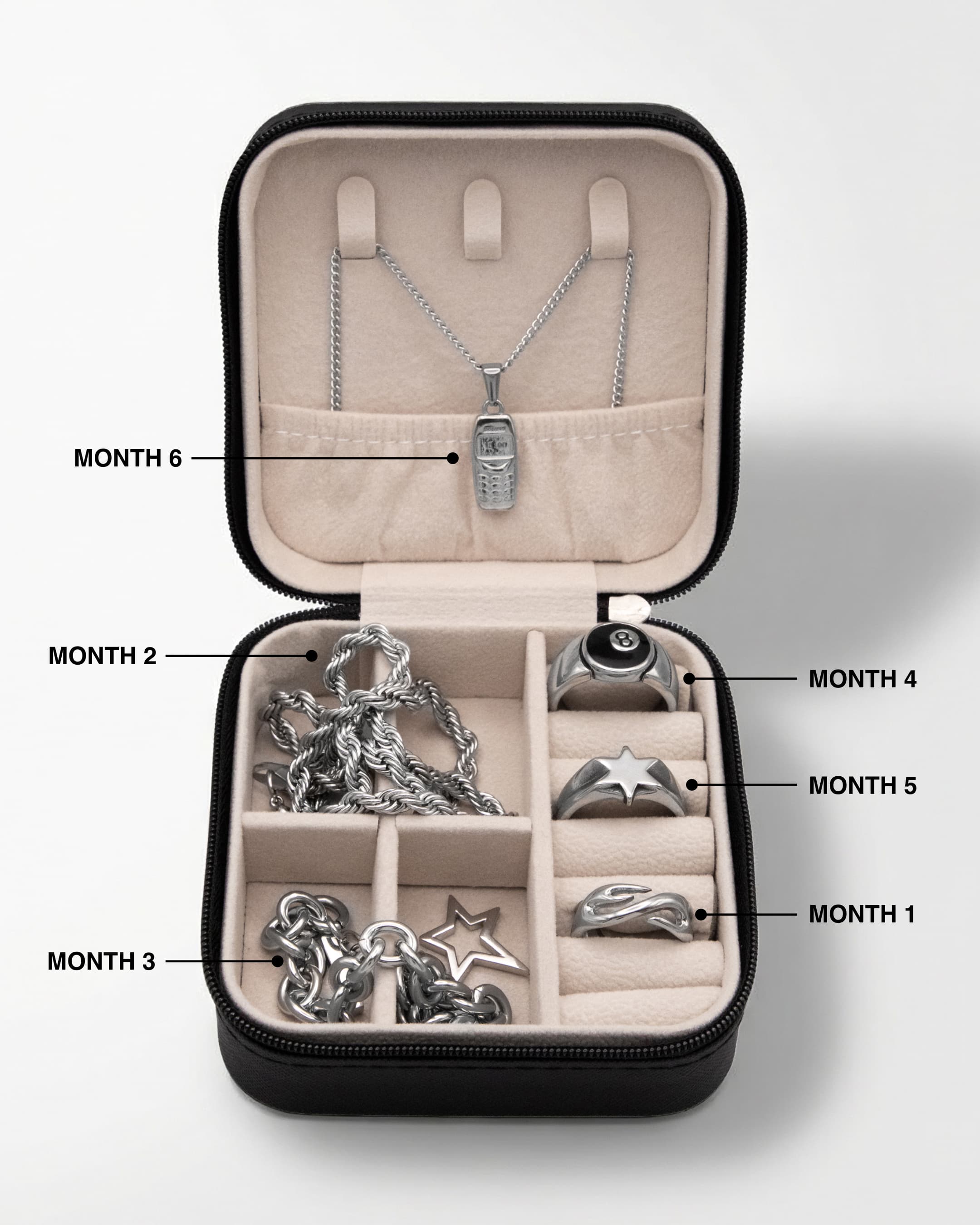 You’ll receive 1 or 2 curated pieces each month. Rings, pendants, chains or bracelets are selected based on your style preferences. Your first delivery also includes a premium jewellery box designed to hold and build your collection month after month.